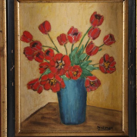 Red Flowers in Blue Vase Floral Oil Painting