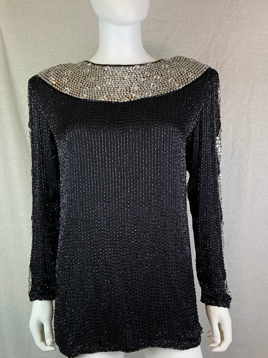 Oleg Cassini Black Silver Sequin Beaded Rhinestone Silk Top
