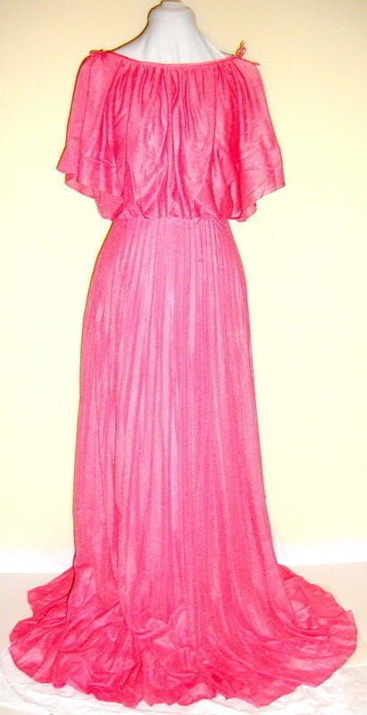 Vintage Pink Tie Shoulder Crepe Pleated Skirt Gown