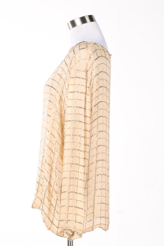VINTAGE BRILLIANTE CREAM WHITE SEQUINED SILKY BLOUSE W/ GOLD 100% SILK