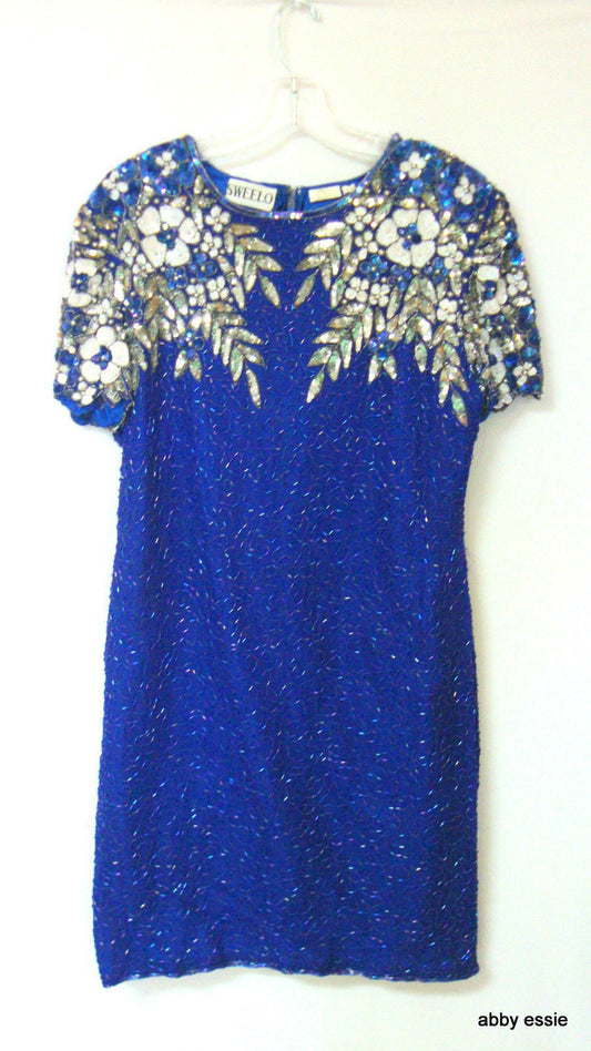 Vintage Royal Blue Silk Sequin Beaded Cocktail Dress
