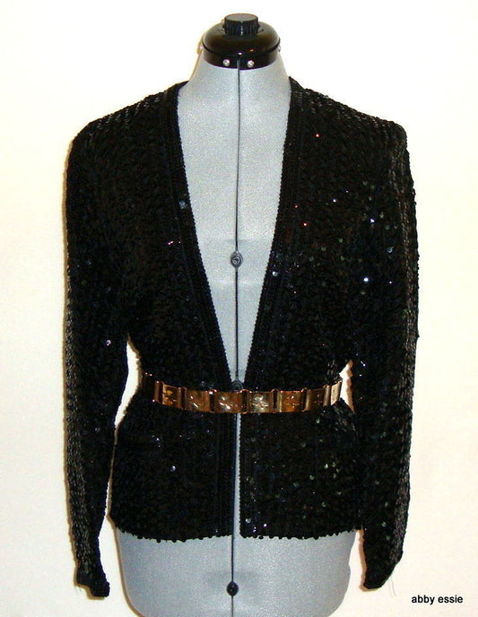 VINTAGE PARTIQUE NEW YORK BLACK SATIN SEQUIN RUCHE COCKTAIL FORMAL JACKET LARGE