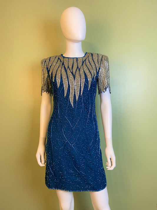 Vintage Stenay Blue Turquoise Sequin Silk Trophy Cocktail Dress