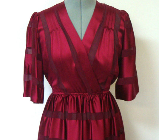 Vintage SWEET TALK RED BURGUNDY SILK STRIPED SHEER FULL SKIRT COCKTAIL DRESS SMALL 5 6