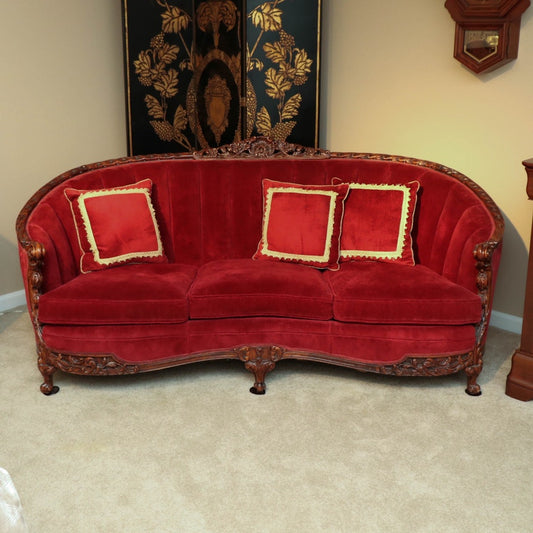 French Rococo Carved Walnut Mahogany Red Velvet Settee Sofa