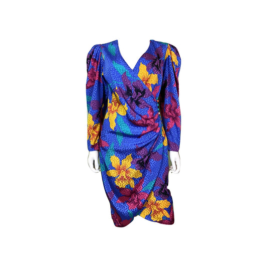 Vintage Tan Brown Green Short Sleeve 80s Foliage Wrap Dress