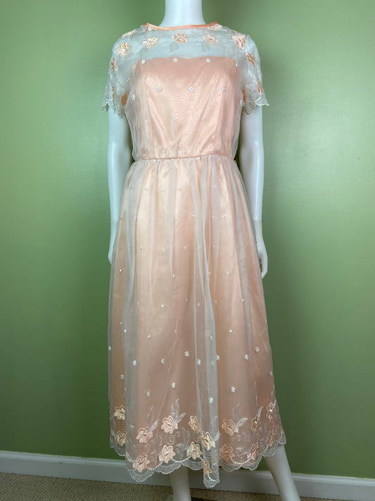 Vintage Victorian Bespoke Pink Peach Satin Sheer Embroidered Floral Lace Dress Gown