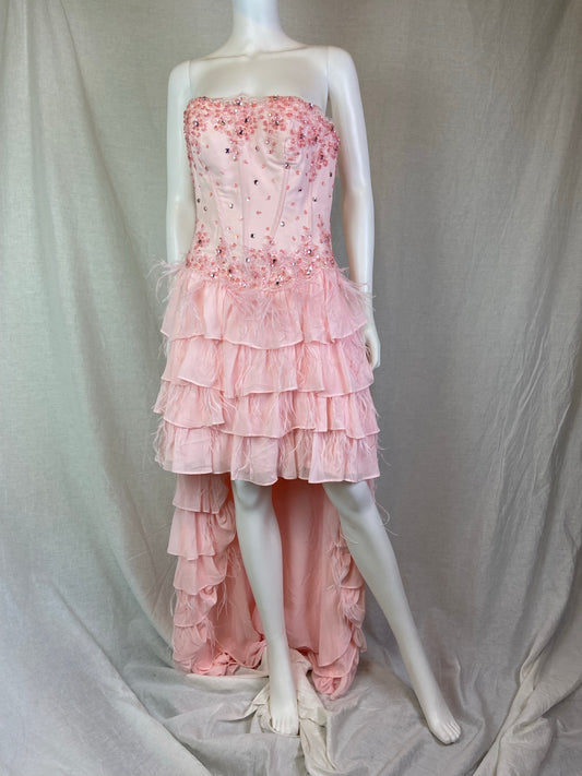 Pink Bustier Rhinestone Feather Boa Ruffle Gown