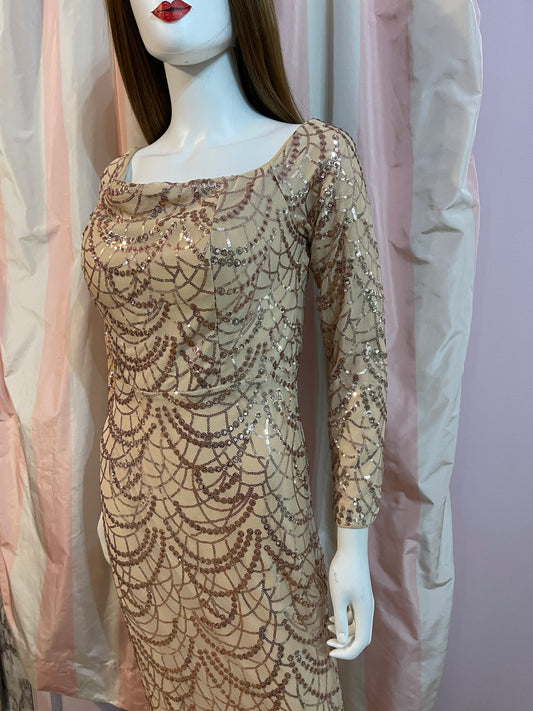 Beige Silk Sequin Sheer Long Sleeve Gown Dress