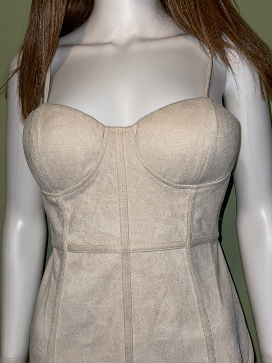 DRESS RENTAL VEGAN SUEDE BEIGE TAN BUSTIER DRESS SLEEVELESS WEDDING