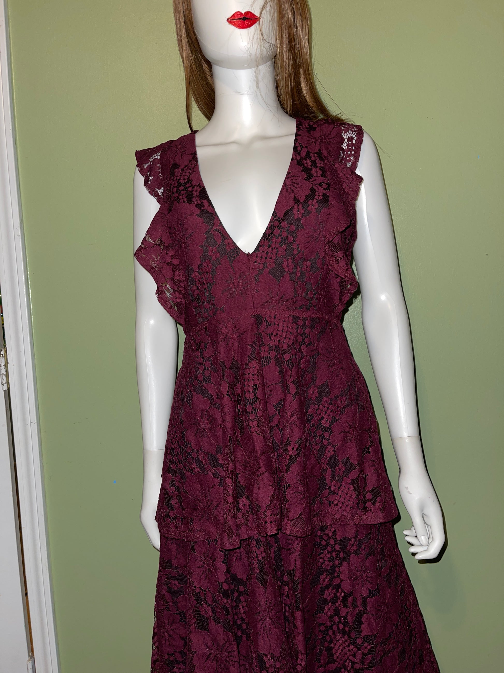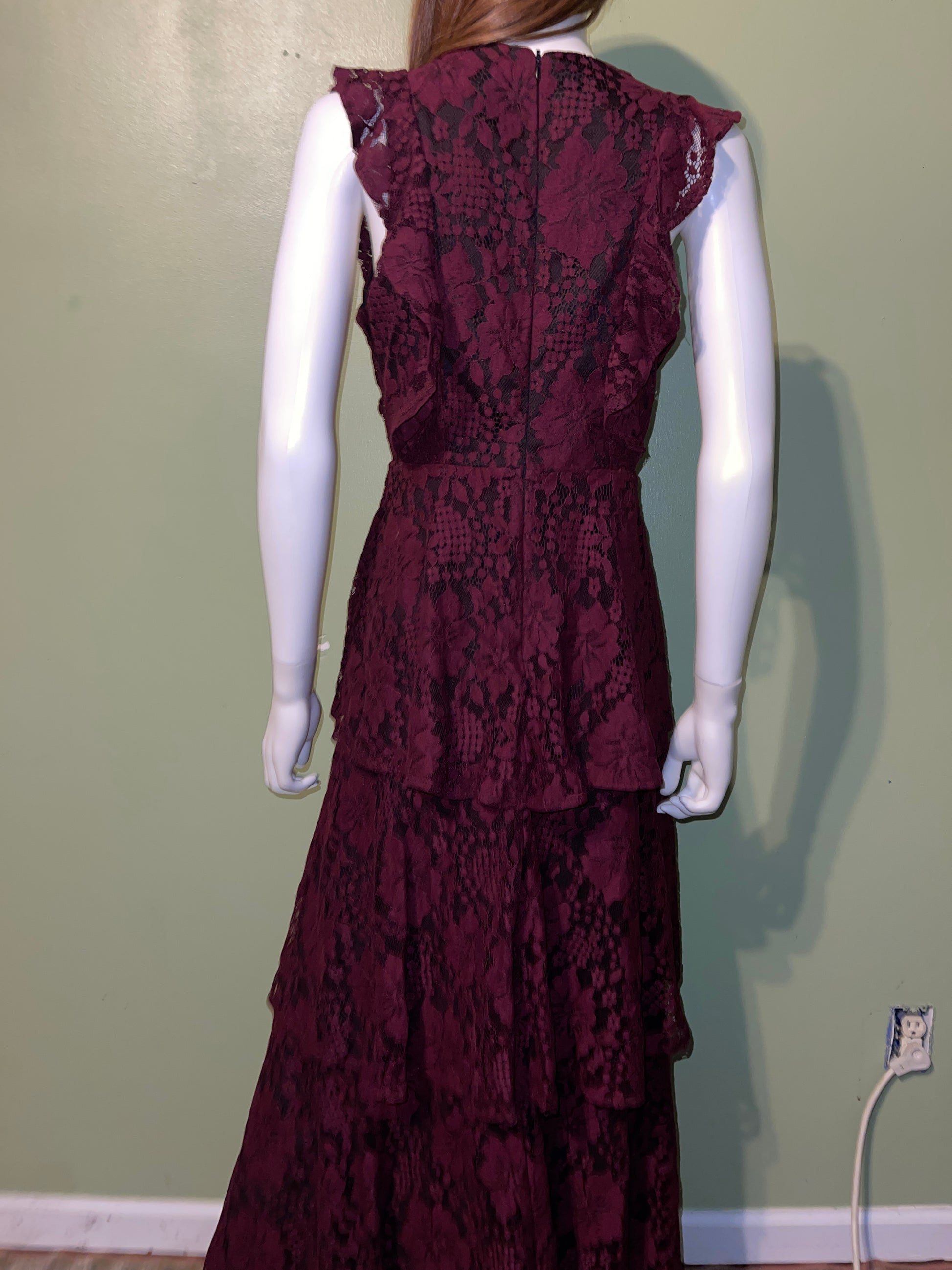 ANTIQUE STYLE DRESS RENTAL RED BURGUNDY LACE VICTORIAN GOTH WEDDING DRESS MAXI DRESS TIERED